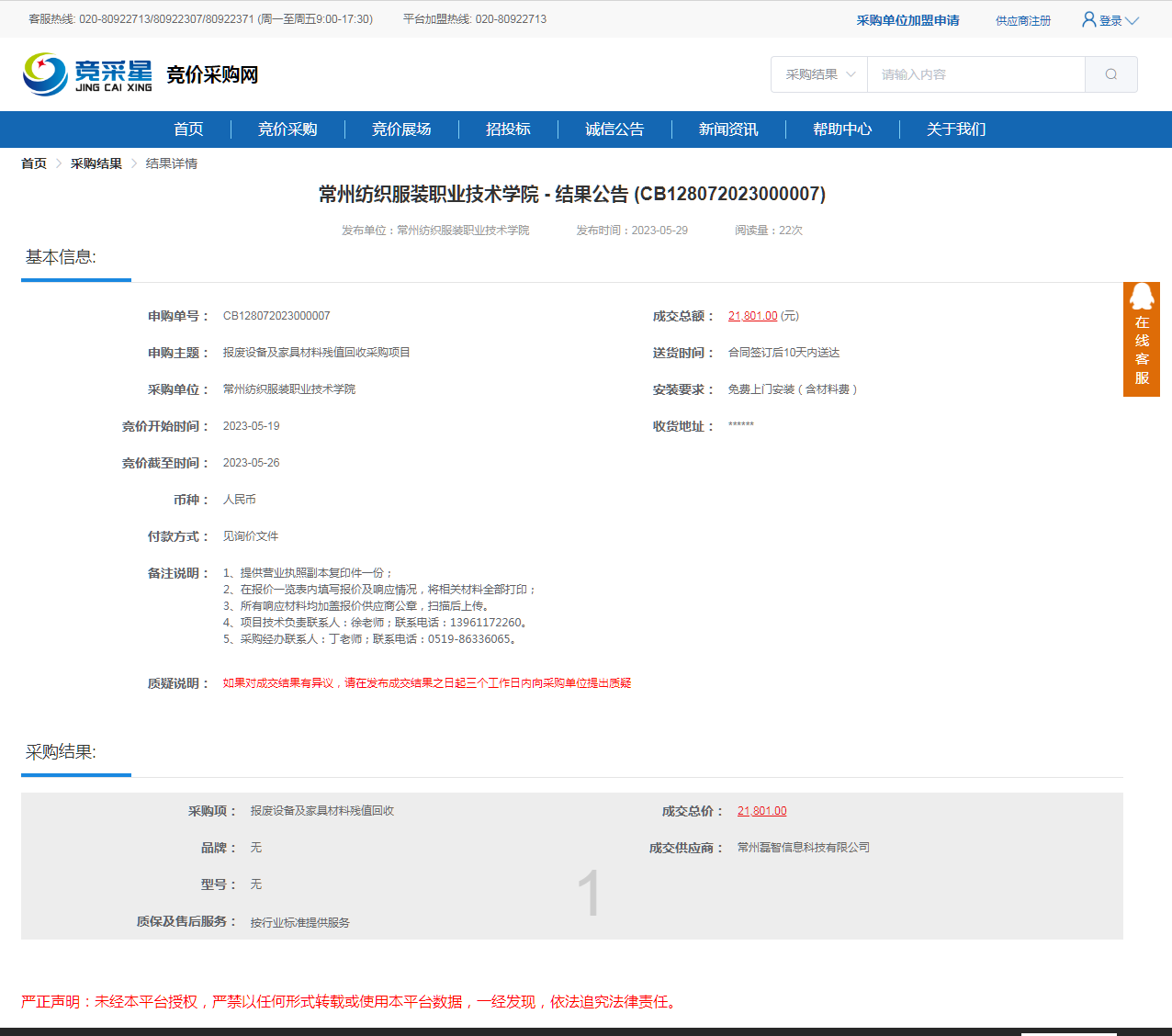 【成交公告】报废设备及家具材料残值回收采购项目成交公告