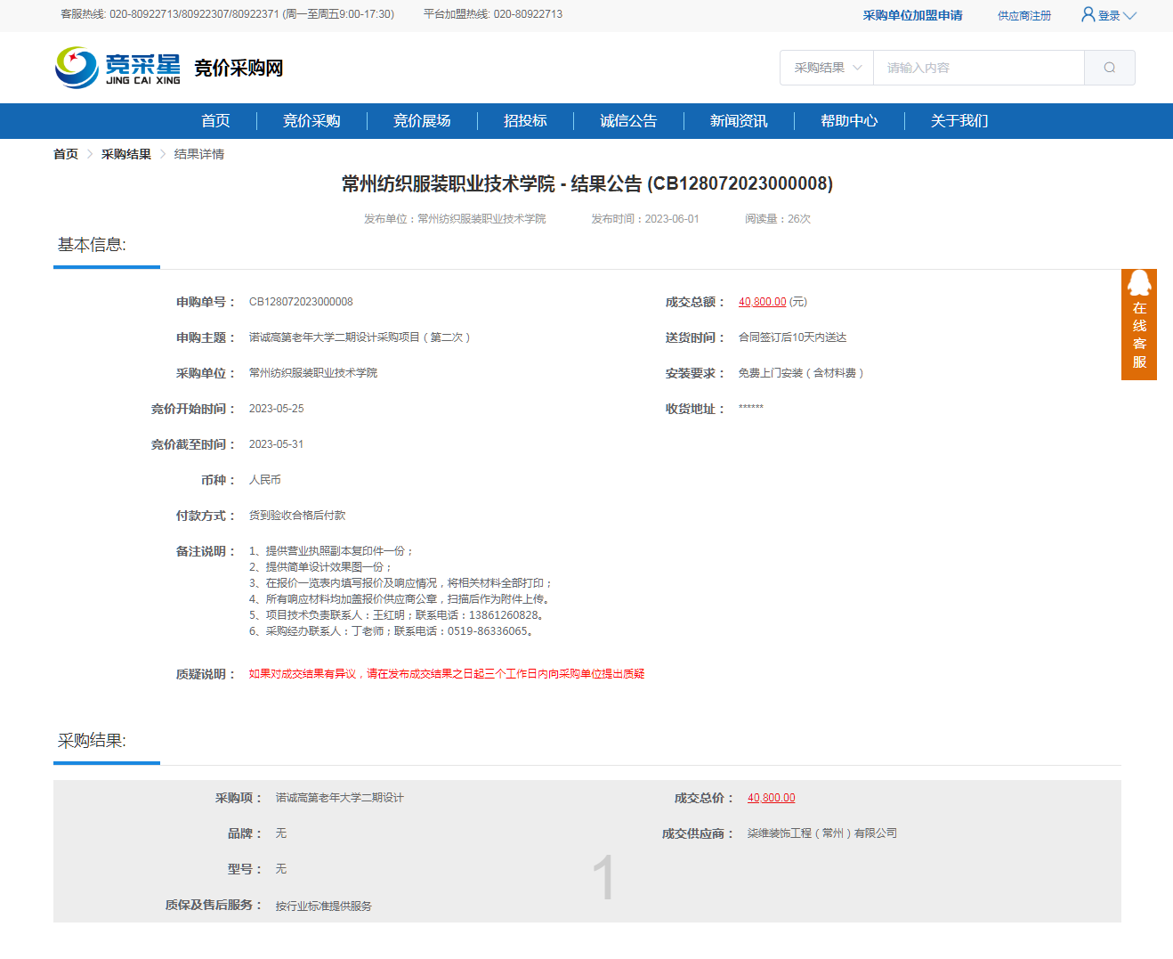 【成交公告】诺诚高第老年大学二期设计采购项目成交公告