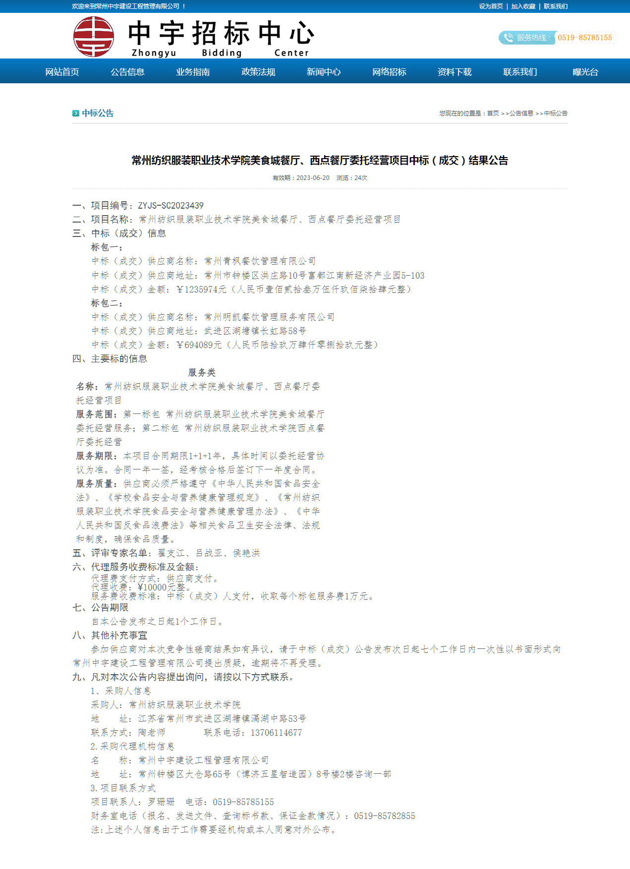 【成交公告】美食城餐厅、西点餐厅委托经营项目成交结果公告