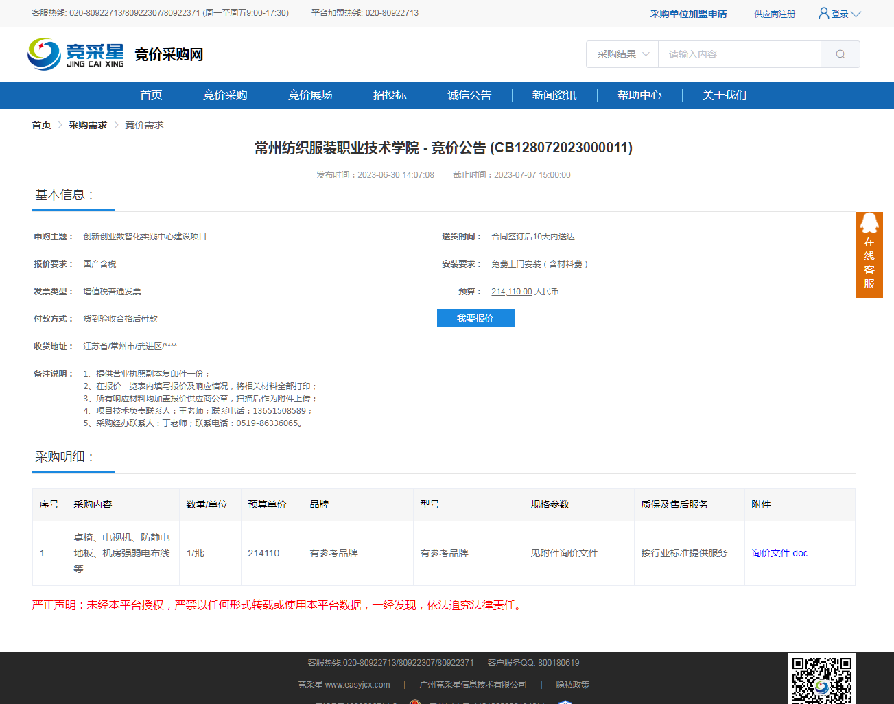 【采购公告】创新创业数智化实践中心建设项目询价公告