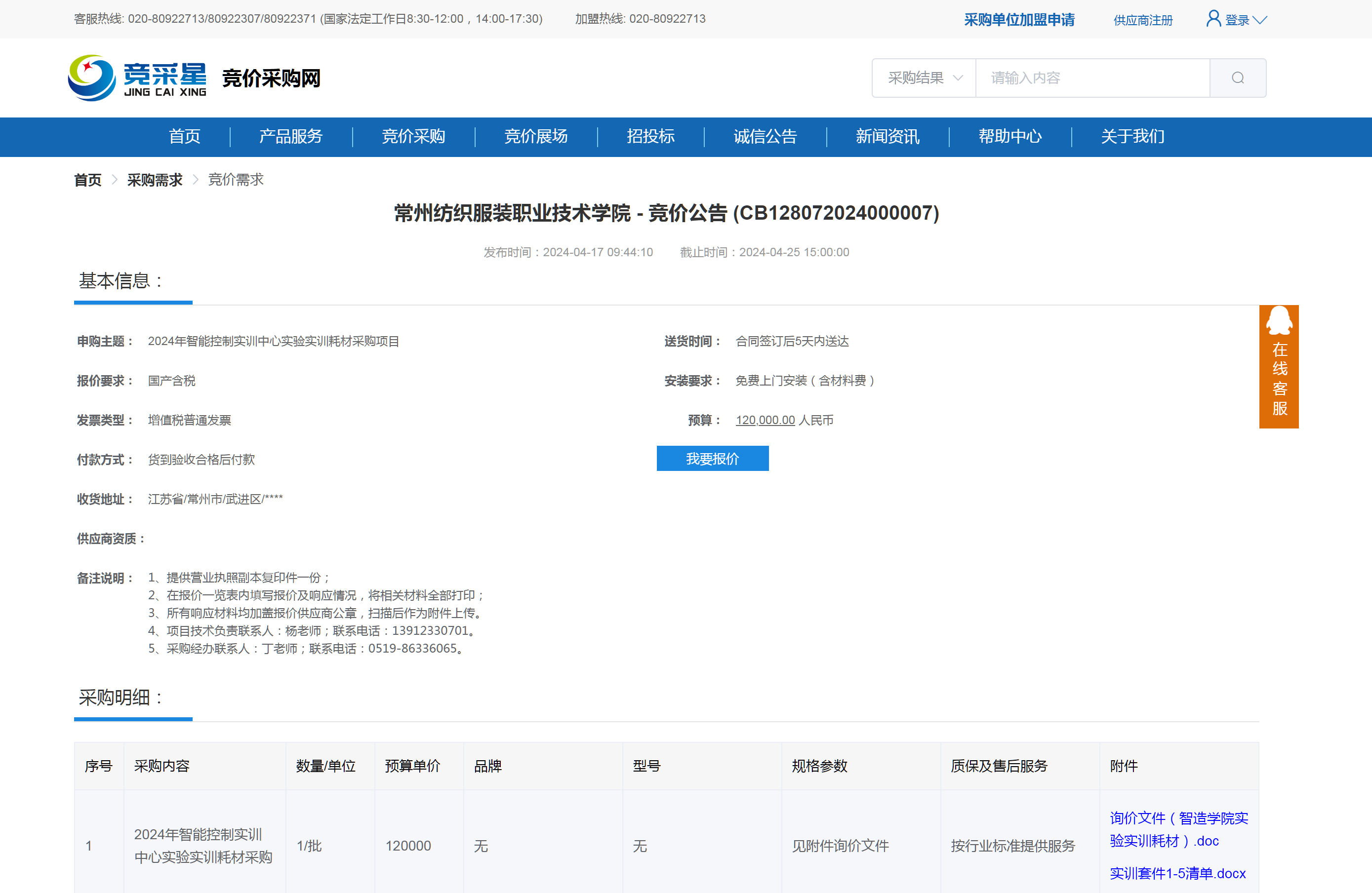 【采购公告】2024年智能控制实训中心实验实训耗材采购项目询价公告